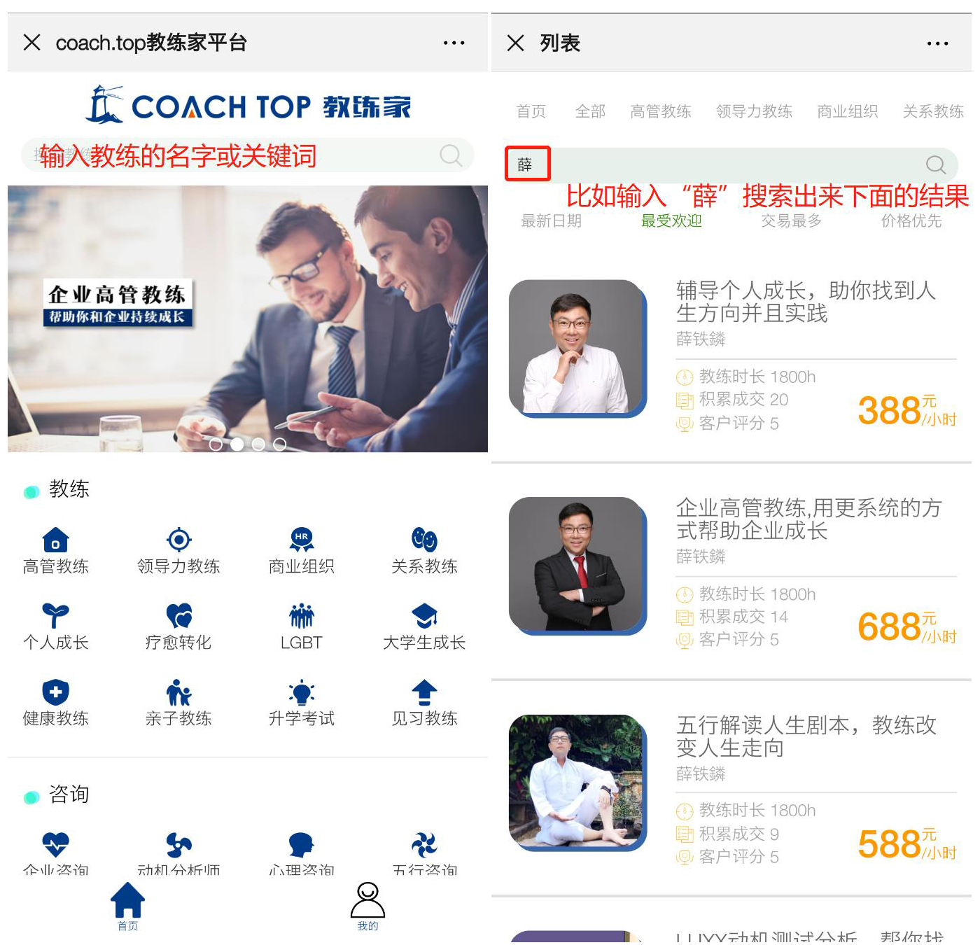 1、 通过搜索框查找自己熟悉的教练