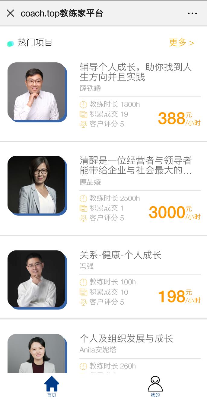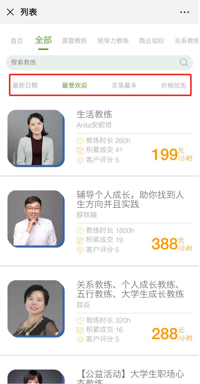 4、 点击【热门项目】后面的【更多】通过【最新日期】【最受欢迎】【交易最多】【价格优先】等维度筛选教练