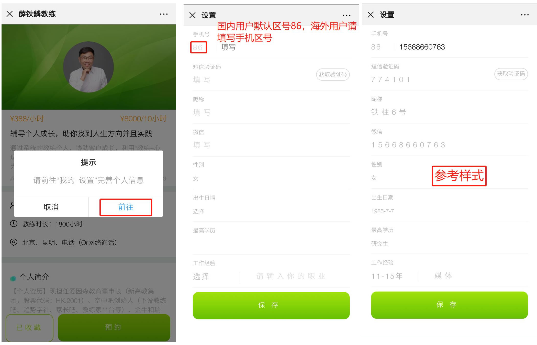 2、 点击【预约】后提示【完善个人信息】,为了让你的教练可以联系到你以及更多了解你的基本信息,请填写真实信息(备注:老用户请跳过此步)