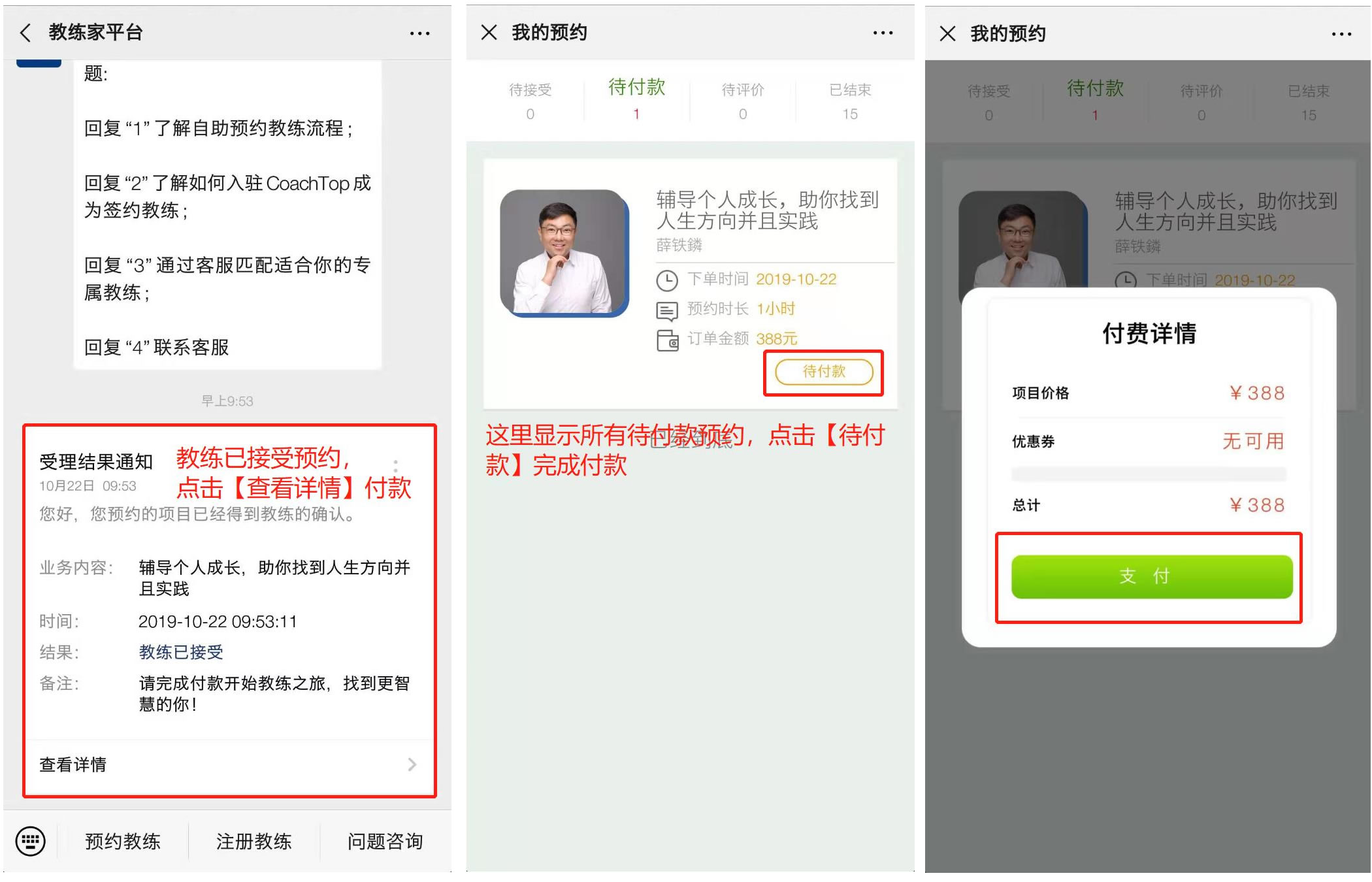 1、【预约】后等待教练确认(备注:根据您的需求填写情况教练会直接确认或先联系您了解更多的信息决定接受或拒绝),教练确认后会收到微信提醒【付款】