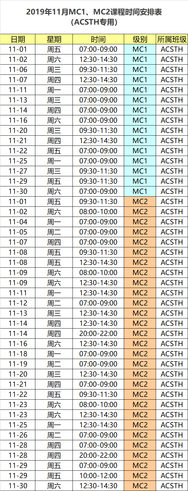 2019年11月MC1、MC2课程时间安排表(ACSTH专用)