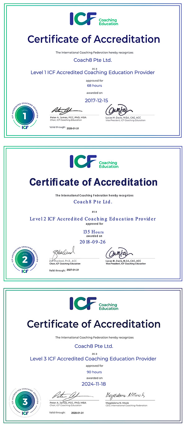 2018年Coach8加入ICF(国际教练组织)的培训项目,成为ICF授权认可的全中文授课线上教学机构。ICF认证培训经历了严格的审查过程,从而证明Coach8的课程体系符合ICF对教练、核心能力和道德准则的要求。