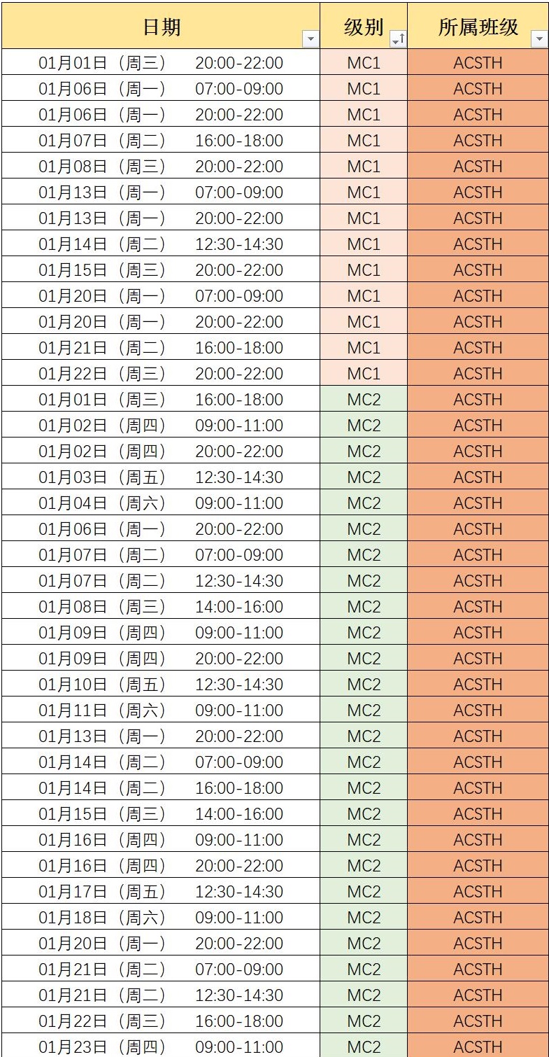 2020年1月MC1、MC2课程时间安排表(ACSTH专用)