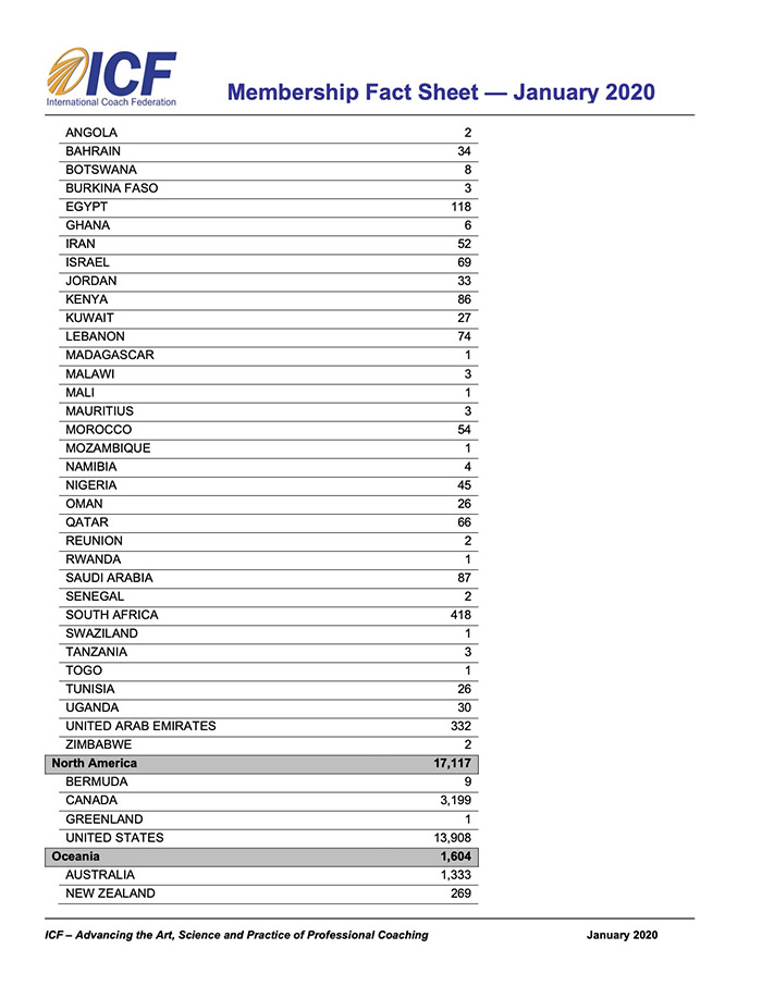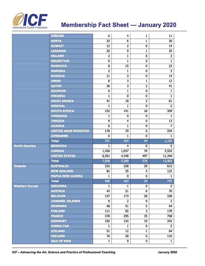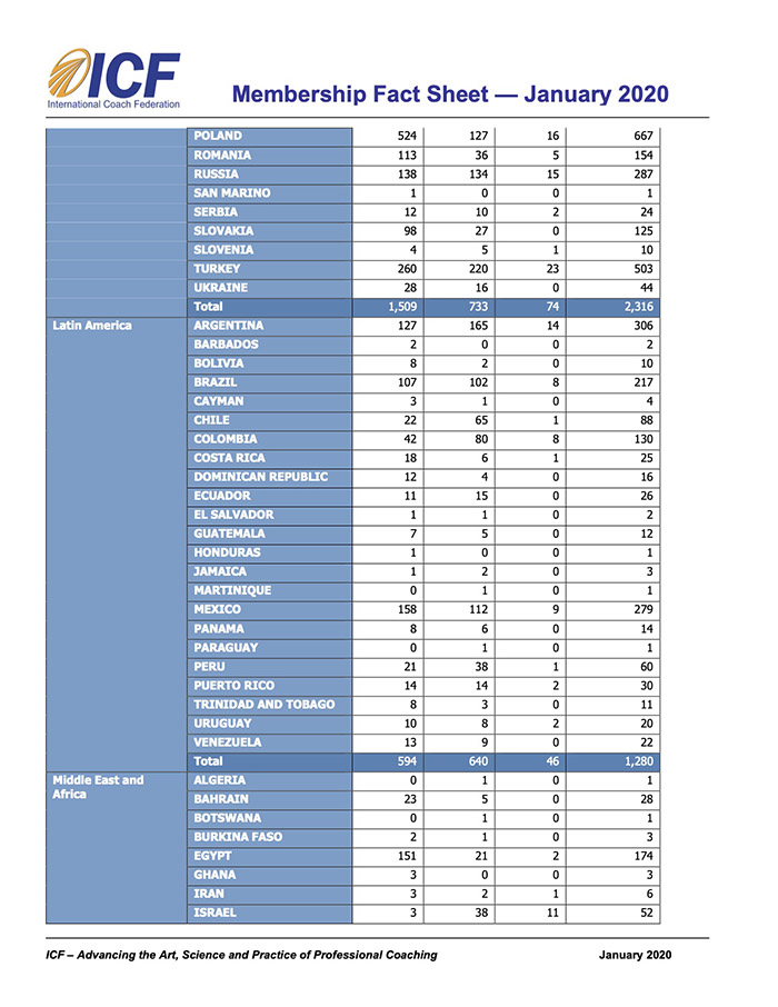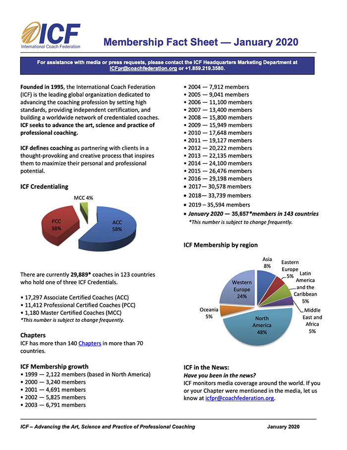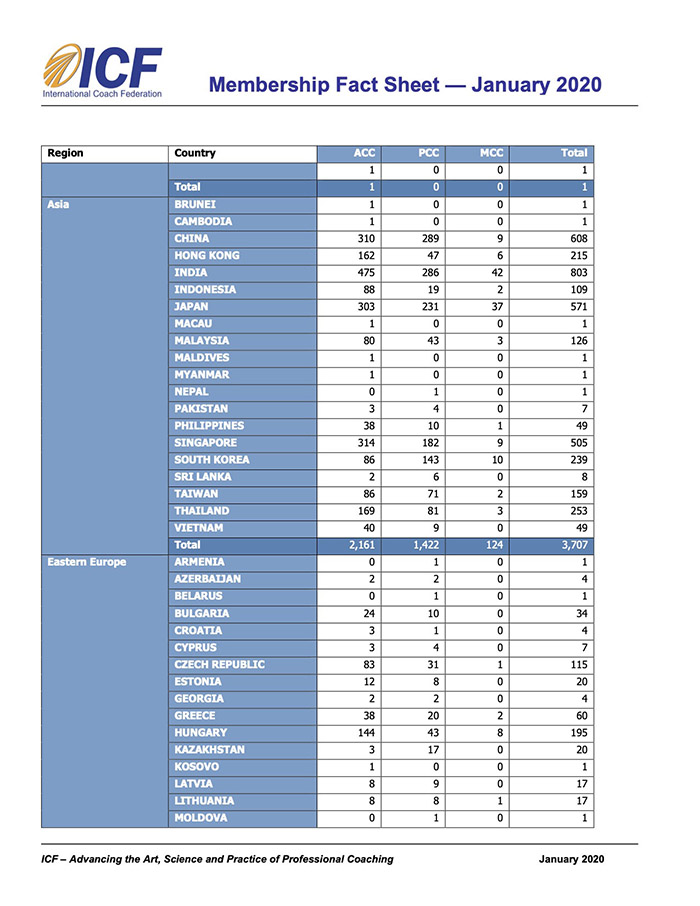 成立于1995,国际教练联合会(ICF)是全球领先的组织,致力于通过制定高标准,提供独立的认证,并建立一个世界范围的证书教练教练网络。ICF寻求推进专业教练的艺术、科学和实践。ICF将教练定义为与客户合作的一个发人深省和创造性的过程,激励他们最大化他们的个人和专业潜力。(以下数据都是截止到发稿日的统计,数量会随着日期的变化而发生变化)