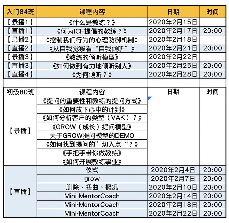 2020年2月入门、初级项目时间安排表