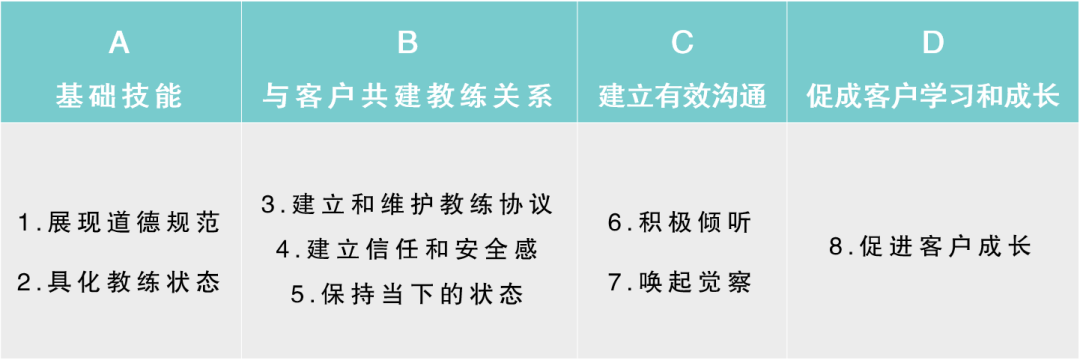 2019年ICF(国际教练联盟)公布了最新的教练核心技能,从原来的11项变成了8项,分成4个大类: