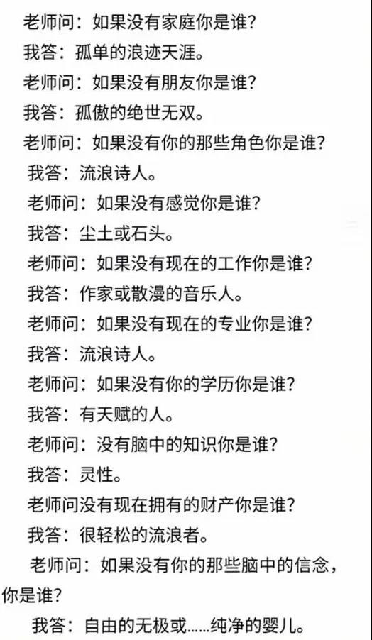 这套题除了让我看到自己放不下的诗意浪漫和骄傲,还让我看到了另一个层面:别的女同学会答,孤独的女人,自由的女人等等。而我,在答案里绝对没有出现“女人”两个字。