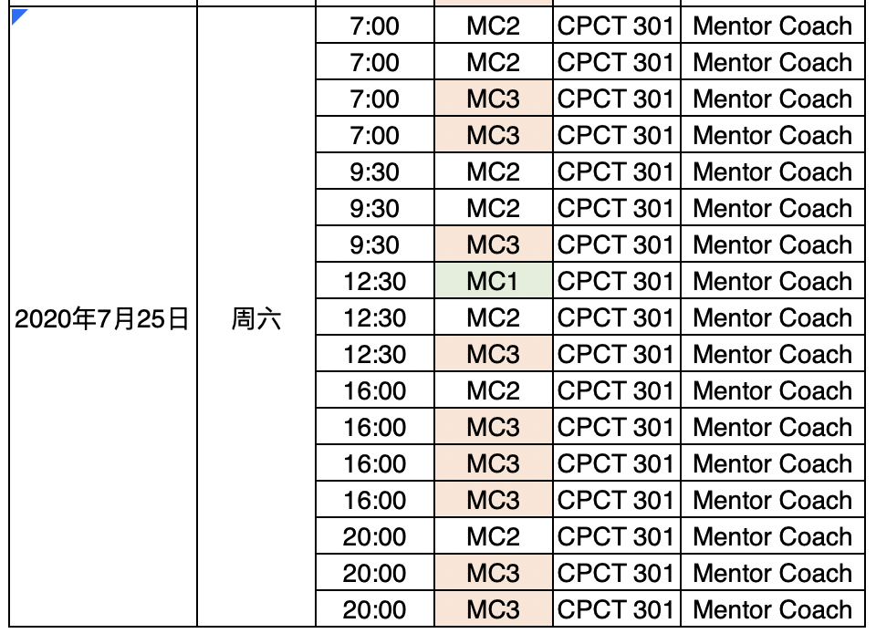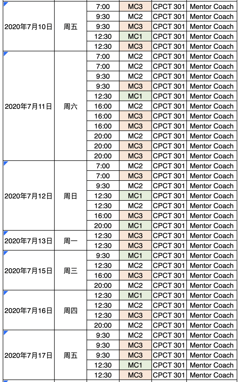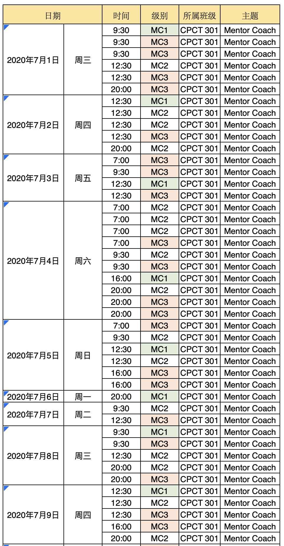 2020年7月MC3及MC(加场)课程时间安排表(CPCT301)