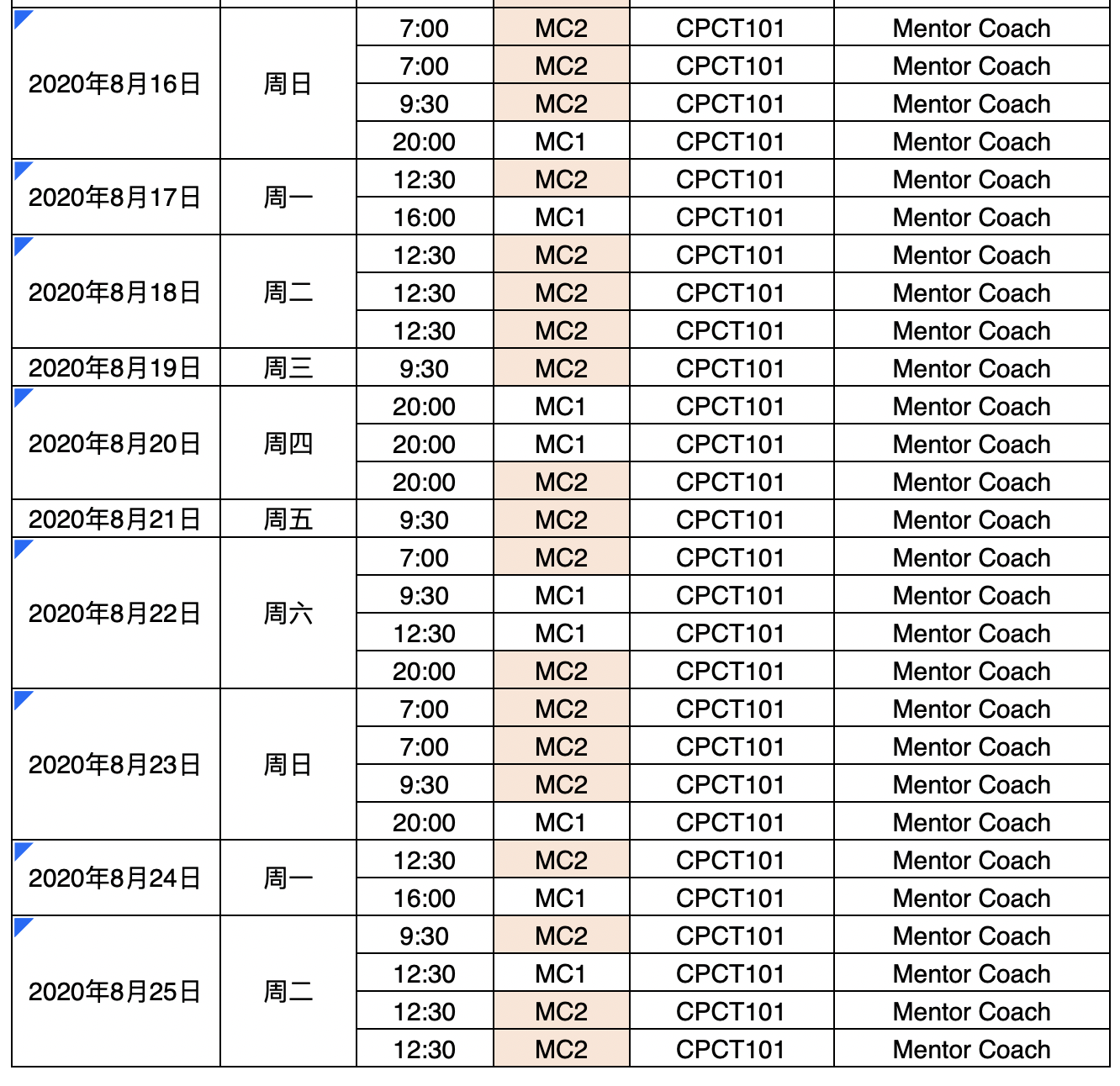 2020年8月MC1、MC2课程时间安排表(CPCT101)