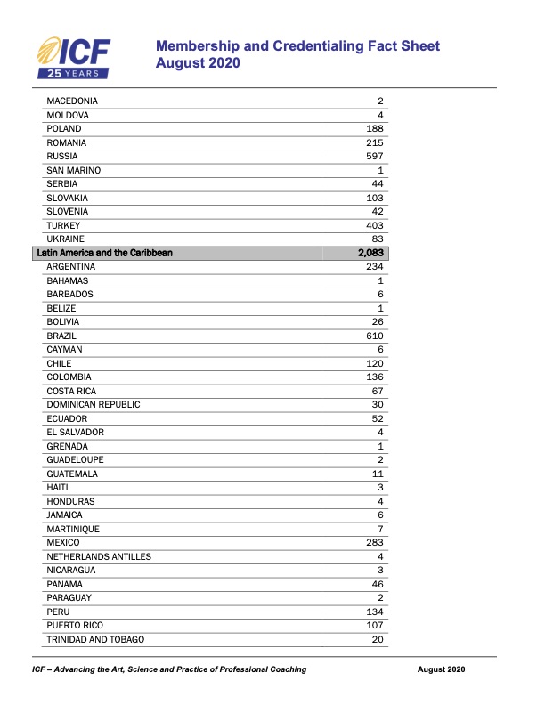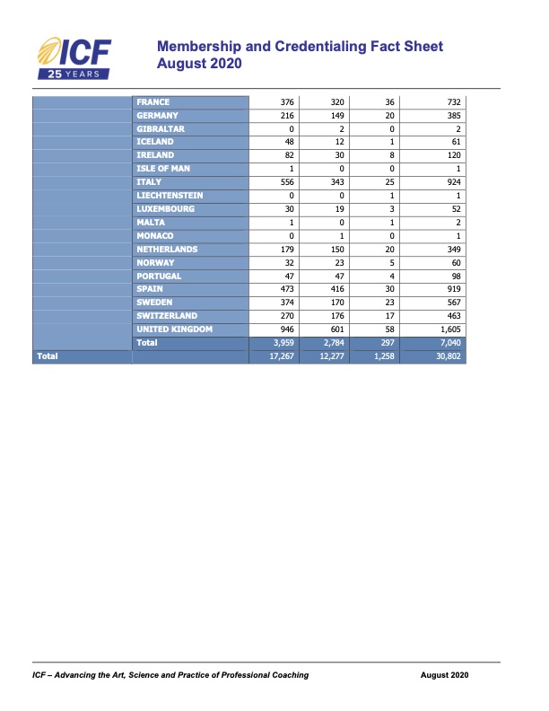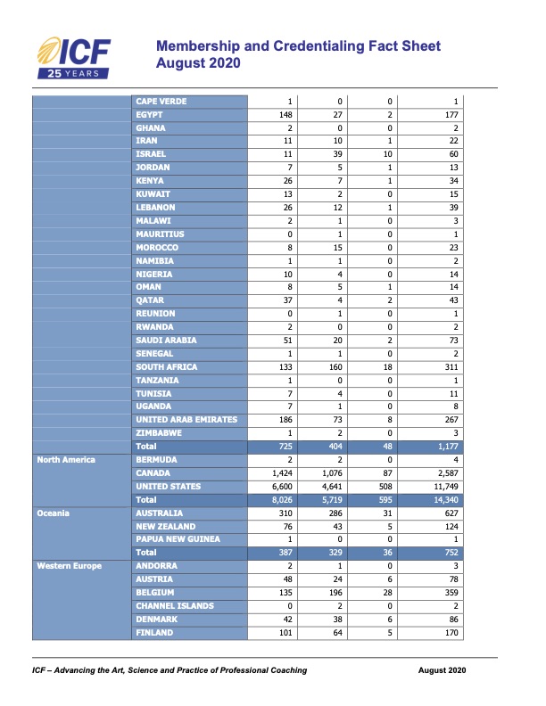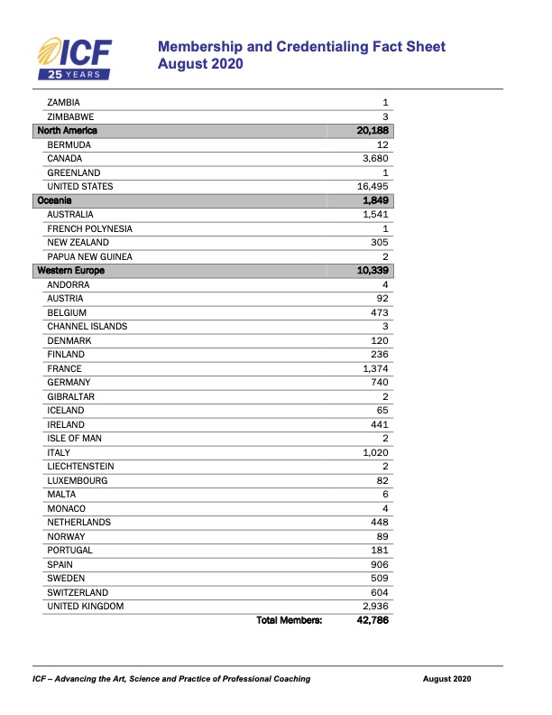 成立于1995,国际教练联合会(ICF)是全球领先的组织,致力于通过制定高标准,提供独立的认证,并建立一个世界范围的证书教练教练网络。ICF寻求推进专业教练的艺术、科学和实践。ICF将教练定义为与客户合作的一个发人深省和创造性的过程,激励他们最大化他们的个人和专业潜力。(以下数据都是截止到发稿日的统计,数量会随着日期的变化而发生变化)