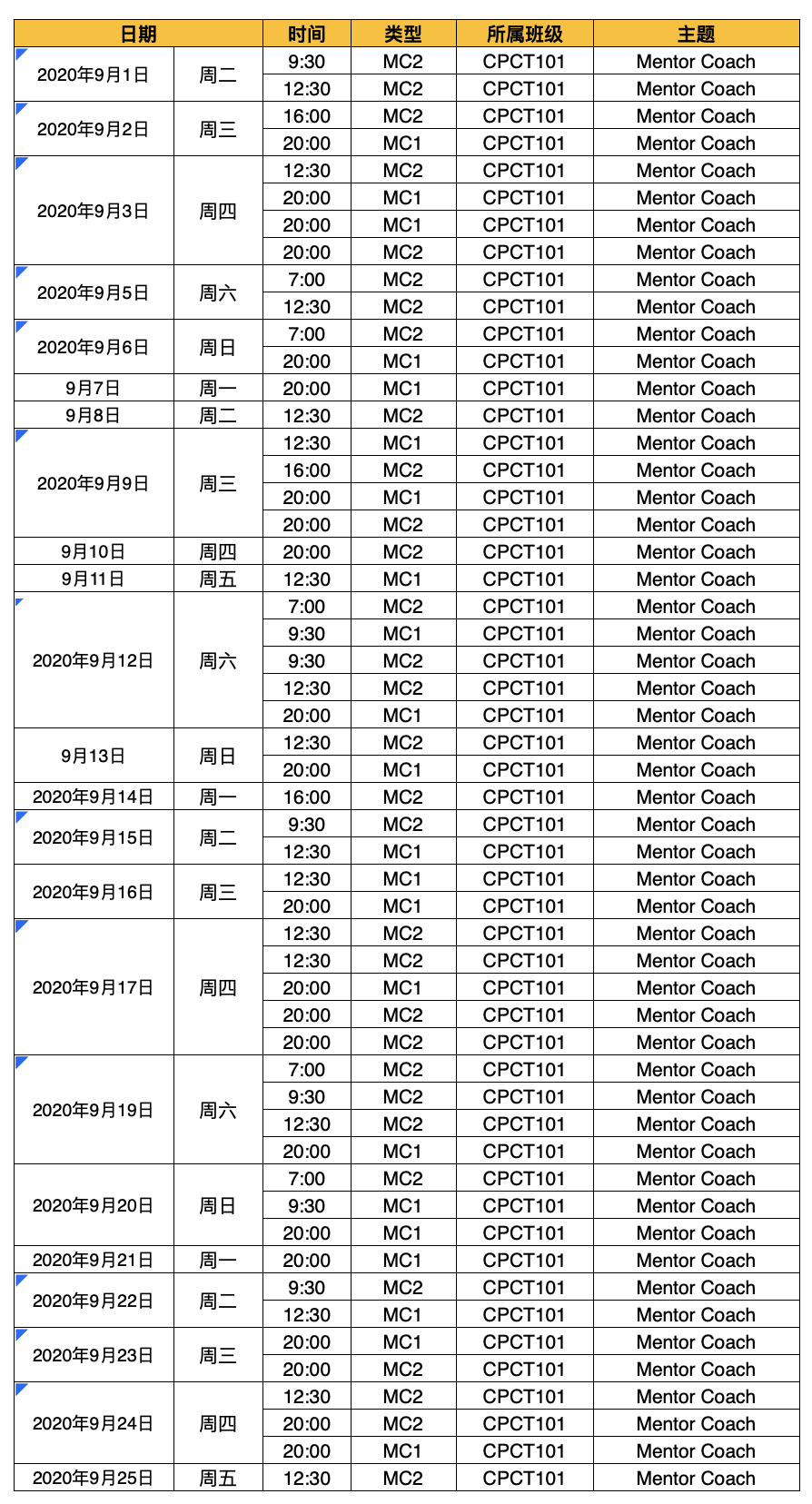 2020年9月MC1、MC2课程时间安排表(CPCT101)