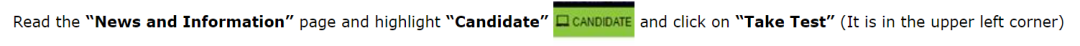 在屏幕左上角有一个绿色按钮写的“Candidate”(候考人),你单击一下,在按钮下方会出现一个下拉菜单,上面写着“Take Test”(参加考试)。