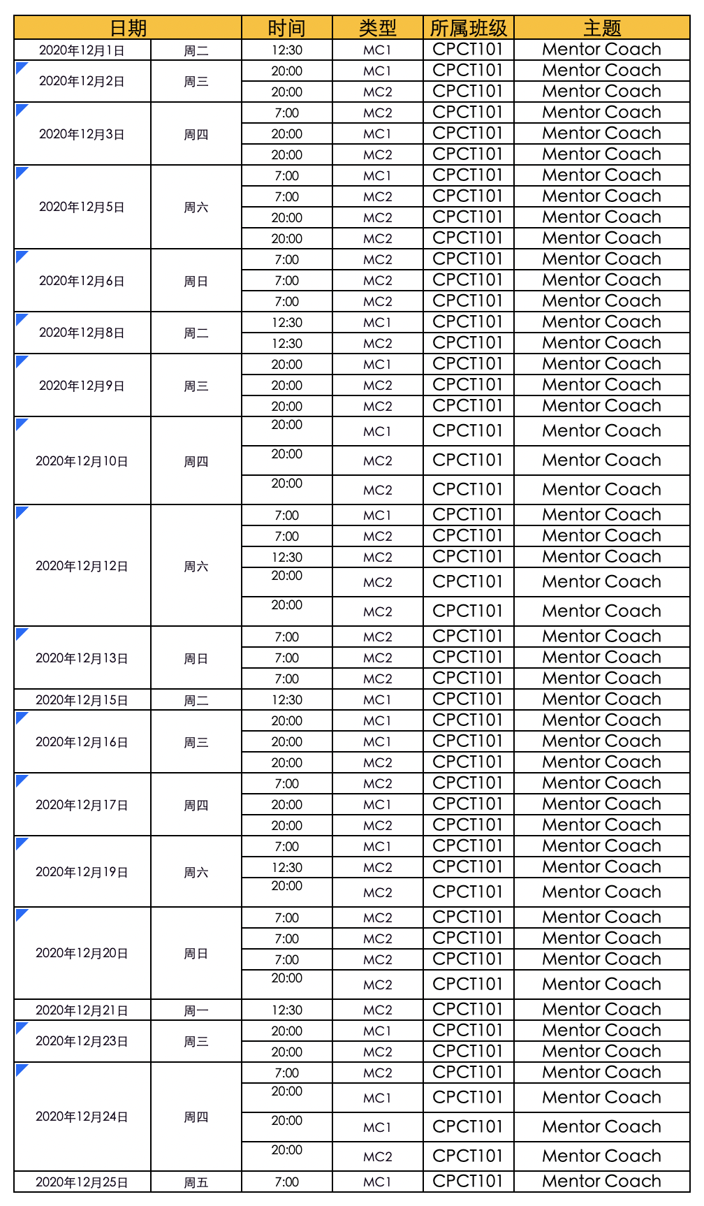 2020年12月MC1、MC2课程时间安排表(CPCT101)